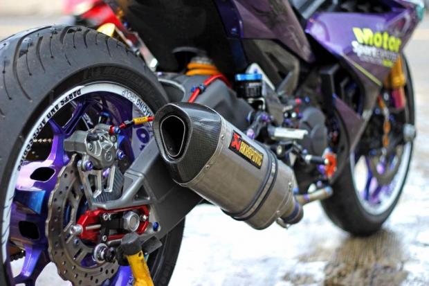 Exciter độ dàn chân trước đầy hầm hố với dè thiết kế giống Ninja 300, phuộc Upside down PKL + cặp heo dầu Yamaha R6, cặp đĩa thắng chế từ ZX-14r, chân chống Ducati