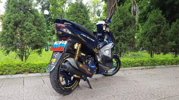 Cặp phuộc bình dầu rời này thực chất lấy từ phuộc Yamaha NVX phiên bản Camo, lò xo được đổi màu cho giống màu bình dầu vô cùng nổi bật, do phuộc NVX thấp hơn nên chủ xe xài thêm 2 cục đôn phuộc bên dưới, cặp mâm được sơn màu xanh rất đẹp mắt, dè sau gắn thêm xinhan nút áo.