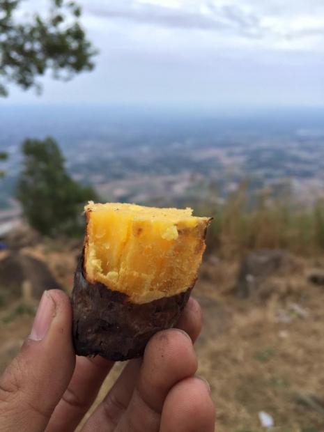 Lên gần tới đỉnh núi, chúng tôi gặp một nhóm bạn. Các bạn chia sẻ cho chúng tôi những củ khoai lang nướng nóng hổi thơm nức mũi. Mà đến sau chuyến đi, một bạn trong nhóm tôi chia sẻ, cảm giác hạnh phúc nhất trong chuyến đi là được ăn củ khoai lang nướng đó.