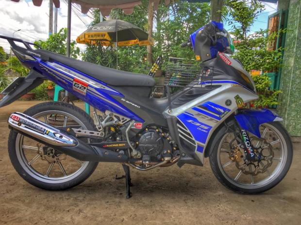 Exciter độ lại ở dàn chân là nhiều với mâm Daytona + đĩa Galfer 260, cản Givi, gác chân Raider được các bạn hay dọn xe ưa chuộng cho dòng Exciter