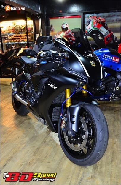 Yamaha R1 thế hệ mới có thiết kế mang hơi thở của những chiếc xe đua MotorGP của hãng xe Nhật, bản độ khoác trên mình bộ cánh full đen mạnh mẽ, nổi bật qua các chi tiết đồ chơi trang bị