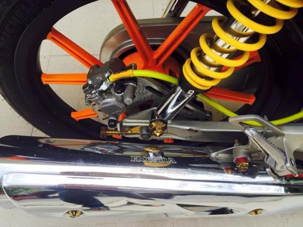 Dàn chân sau đầy hiện đại với gác chân nhôm, dây dầu Morin, full thắng đĩa sâu và phuộc Nice, ngoài ra không quên nhắc đến mâm Daytona được sơn 2 màu