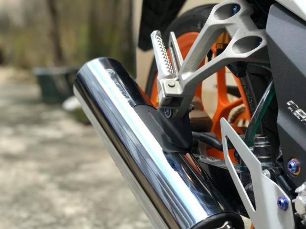 Chủ xe đã phá cách phần yếm trước được loại bỏ hoàn toàn để lộ thiên phần động cơ mạnh mẽ , ống giải nhiệt Samco Sport giúp giải nhiệt tốt hơn , góc nhìn này có thể cho ta thấy cổ pô titan đẹp lung linh trong từng khúc nối . Lốc máy khá nổi bật với đội hình ốc Proti đầy sang trọng cùng ty thăm nhớt Titan .