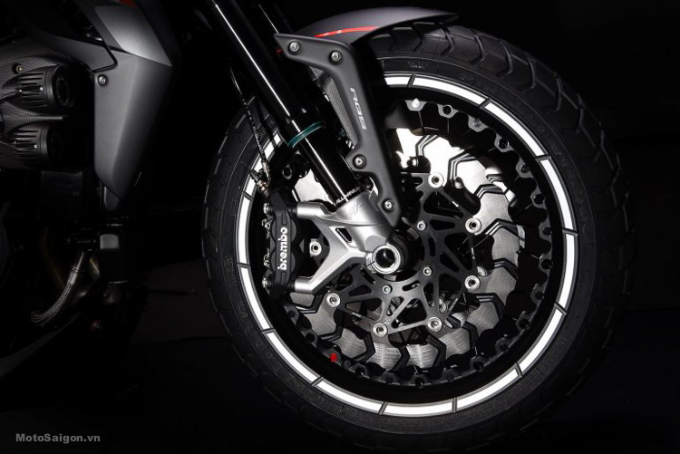 Xe trang bị đèn pha LED dạng tròn, thích ứng với góc cua và tốc độ của người điều khiển. Vành nan hoa gia công bằng máy công nghiệp cho tạo hình lạ của Kineo, lốp Pirelli MT60. Những bộ phận khác như bảng điều khiển, gác chân, ốp bảo vệ động cơ, tay lái đều do bộ phận CRC phác thảo trước.