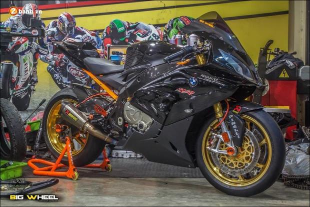 Dàn chân hàng hiệu bên giảm shock Upside Down Ohlins, cặp phanh Brembo Nickel, dây dầu Earls màu sắc tươi tắn, điểm nhấn dàn chân với Mâm Marchesini vàng gold