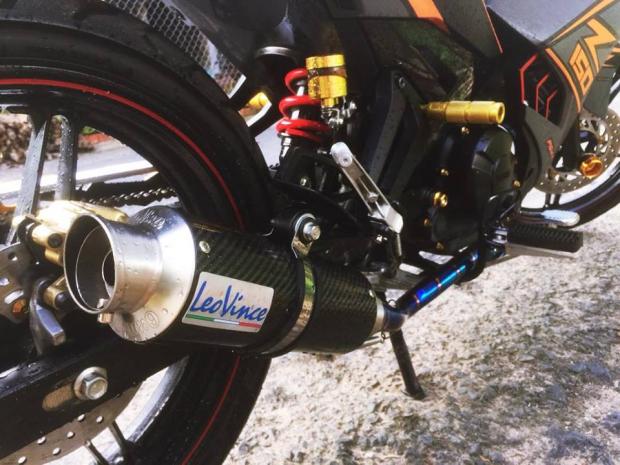 Ấn tượng không kém các mẫu xe độ khác với cổ pô Titan + pô Leovince với âm thanh phát ra đầy uy lực và bình dầu Rizoma