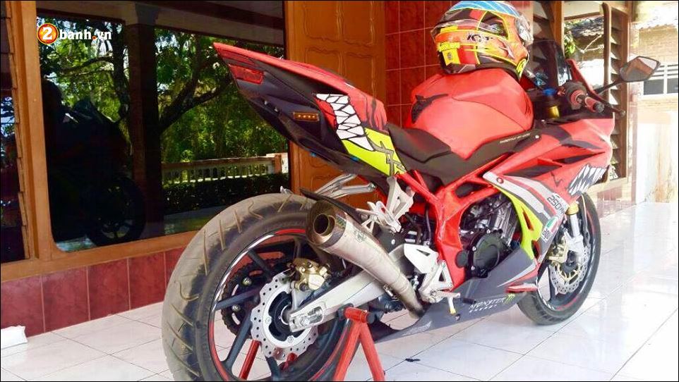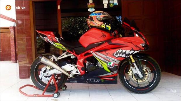 Honda CBR250RR là mẫu sport cỡ nhỏ rất được quan tâm nhất hiện nay bởi vẻ ngoài thực sự ấn tượng: trẻ trung, “hung hãn”, như sẵn sàng gây hấn, với phần đầu xe sắc nhọn, cụm đèn pha đôi công nghệ Led…Để tăng phần dữ tợn hơn cho chiếc xe, chủ nhân của chiếc CBR250RR đã khoác thêm cho nó 1 bộ cánh Cá mập màu đỏ đầy hung bạo.