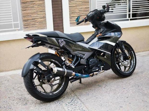 Tổng thể xe đầy hầm hố & nổi bật với bộ áo tem đấu cực ngầu kết hợp cùng hàng loạt món đồ chơi kiểng , phần yên đã gọt lại với kiểu dáng góc cạnh đầy hài hòa đầy thẩm mỹ . Phần đầu nhẹ nhàng với cặp kính gù CRG , cùm tay côn CRG GP hàng hiệu , mặt nạ được trang bị led l4 để hỗ trợ đi đêm ở những cung đường thiếu sáng .
