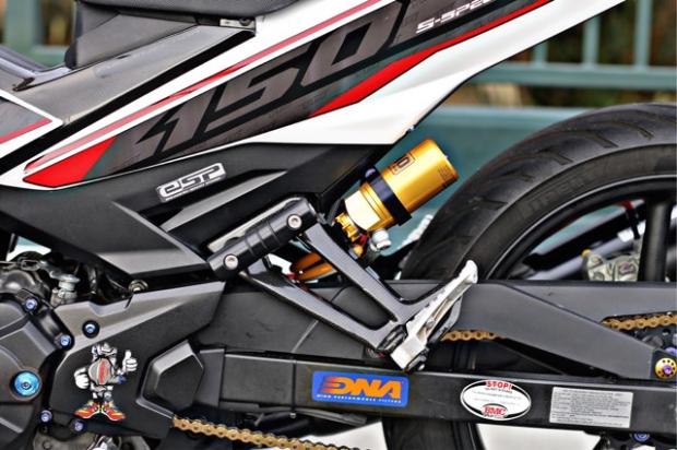 Góc ảnh cho ta thấy toàn cảnh phuộc Ohlins bình dầu rời lắp đầy khoảng trống dưới gầm xe.